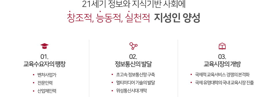 교육수요자의 요구와 산업사회에 부응하는 창의적, 전문적, 차별적 교육을 개발/제공